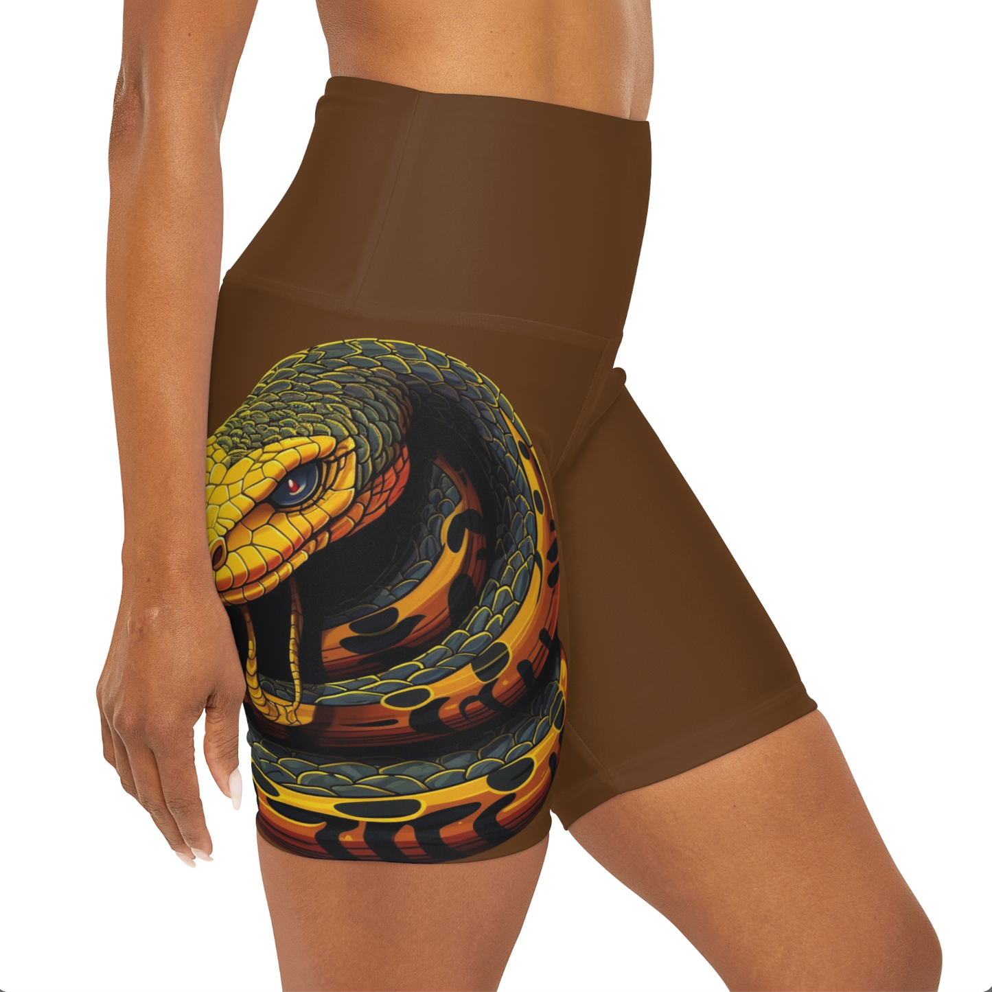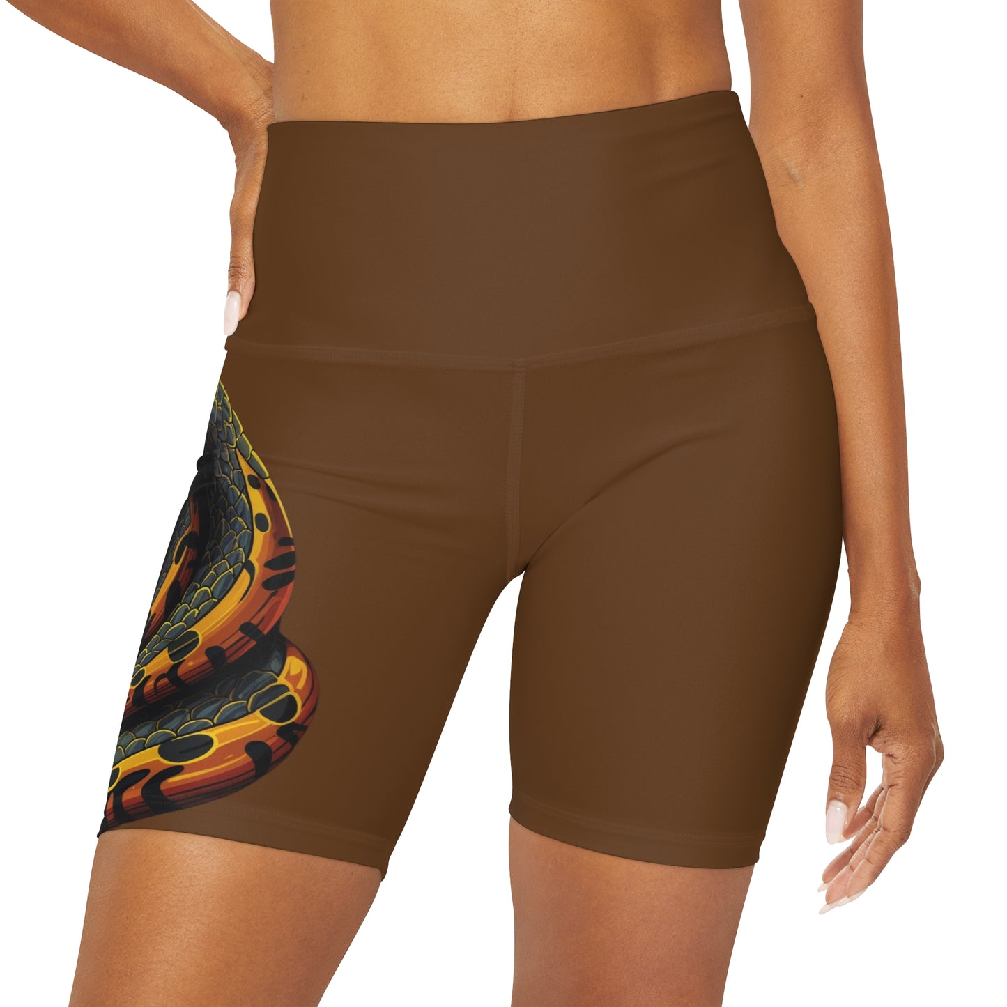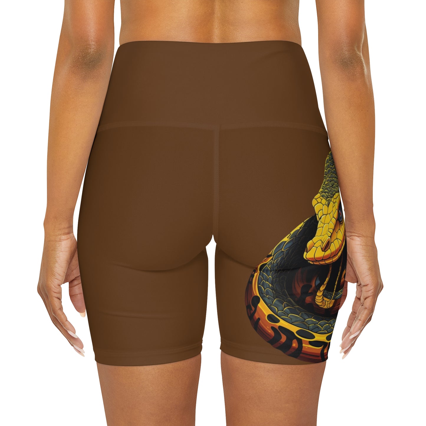 High Waisted Brown Yoga Shorts (AOP) with a Snake design