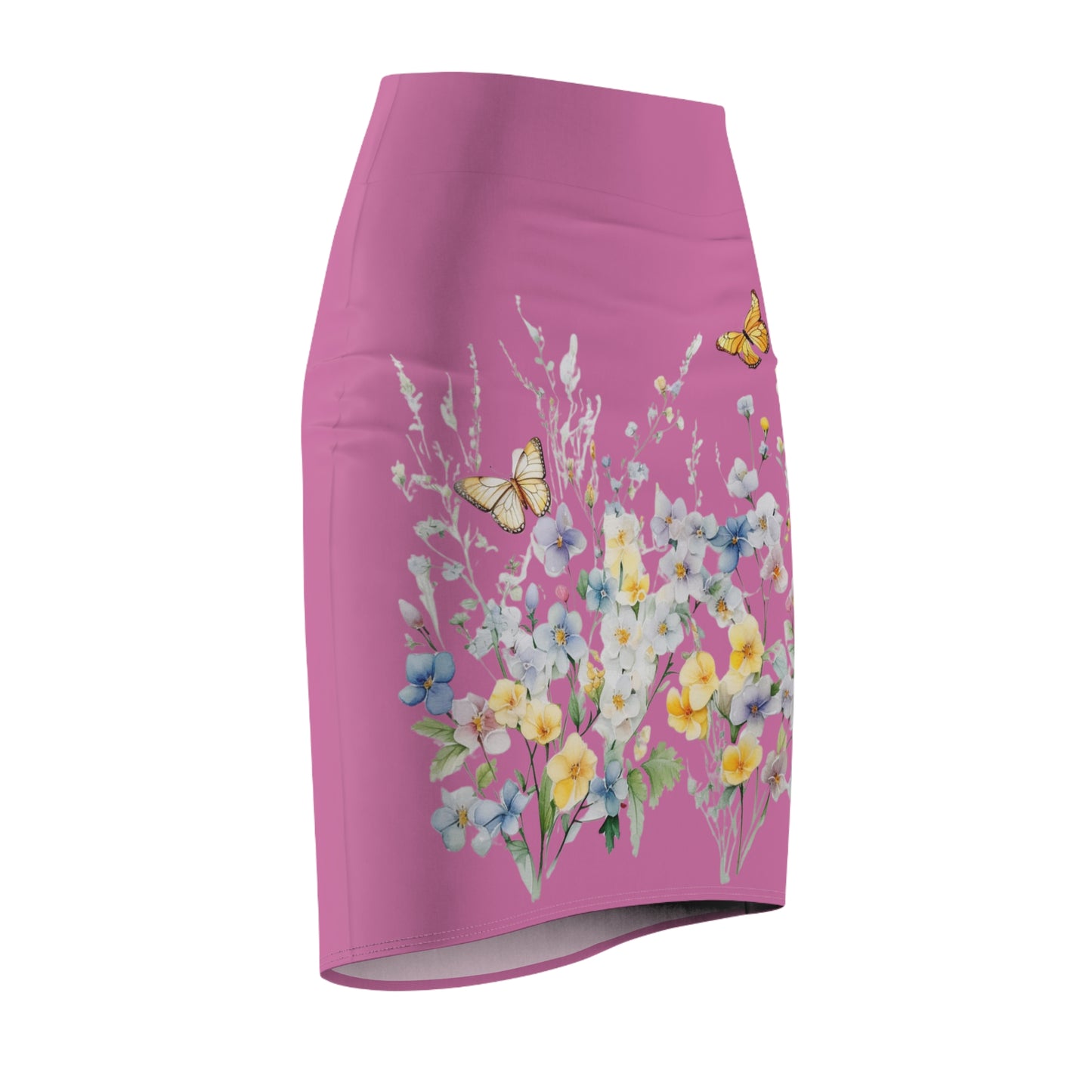 Light Pink Women's Pencil Skirt (AOP) with Spring Flowers and Butterfly