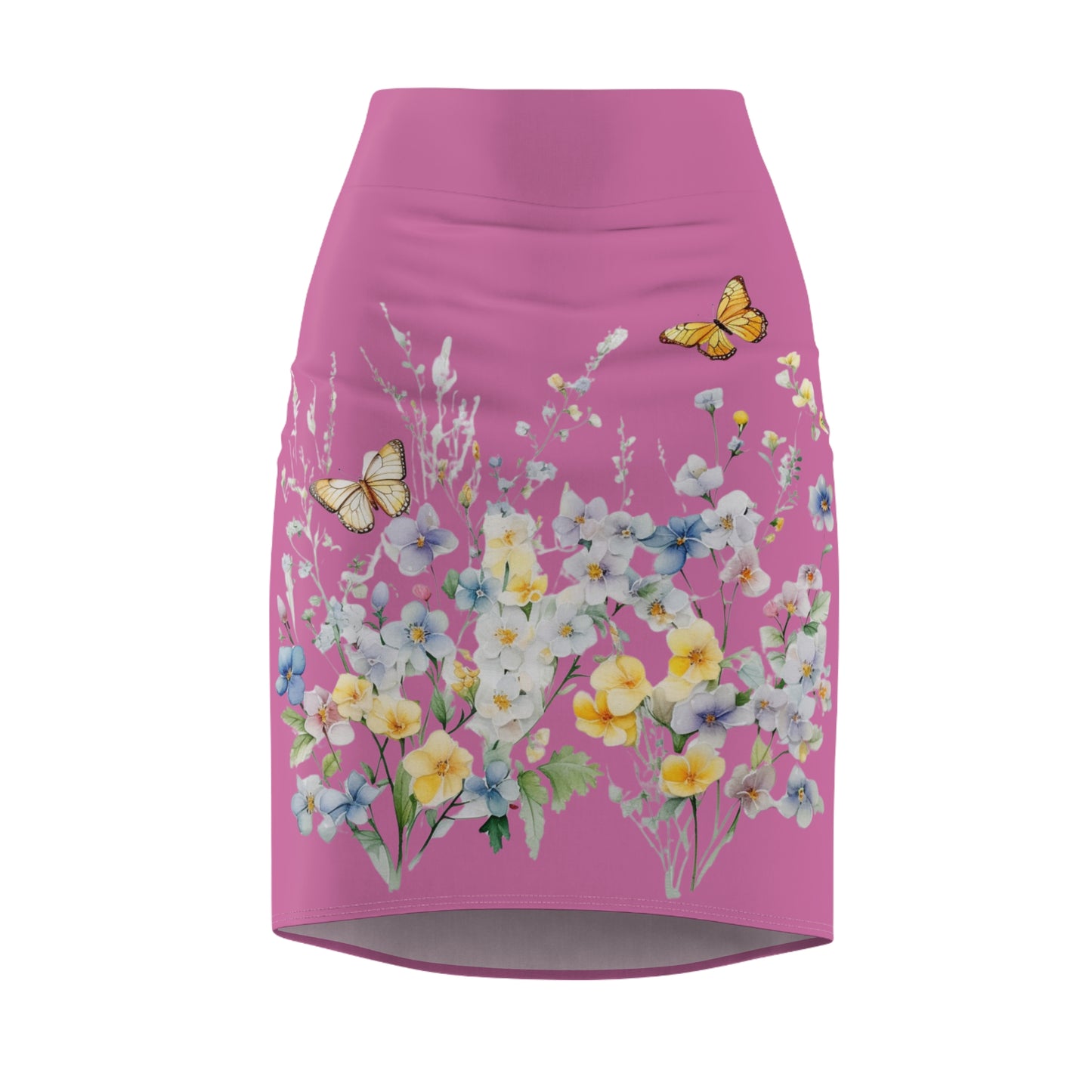 Light Pink Women's Pencil Skirt (AOP) with Spring Flowers and Butterfly