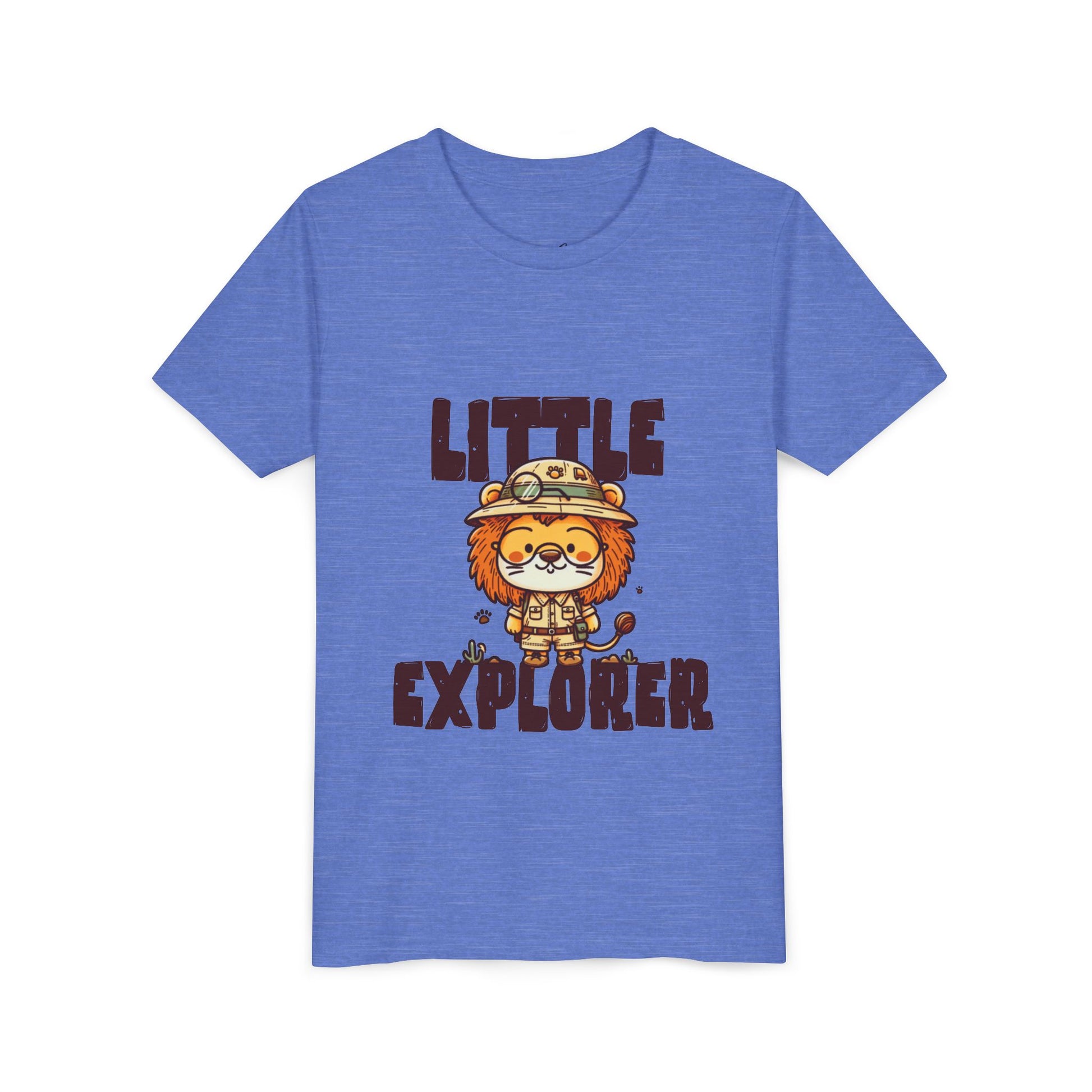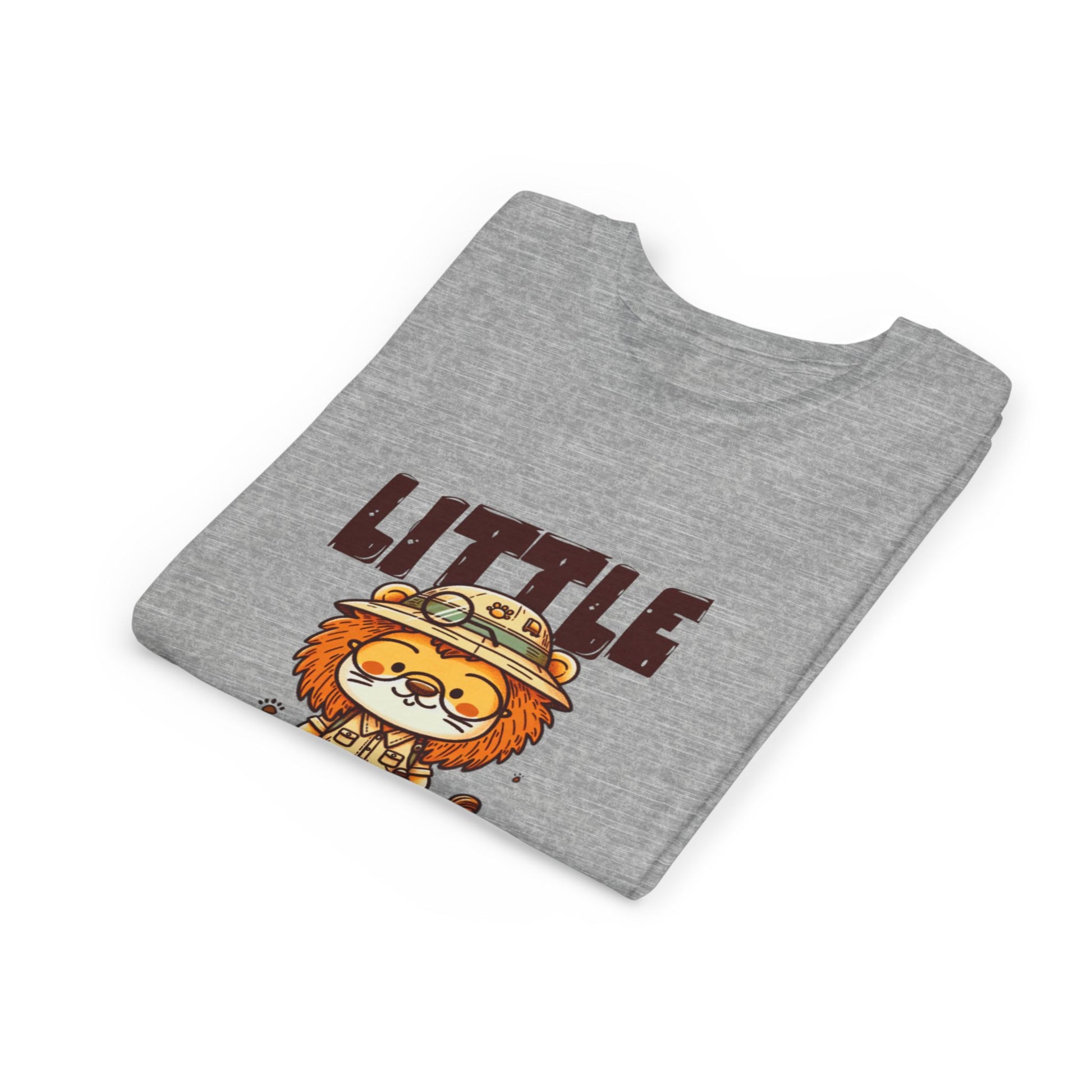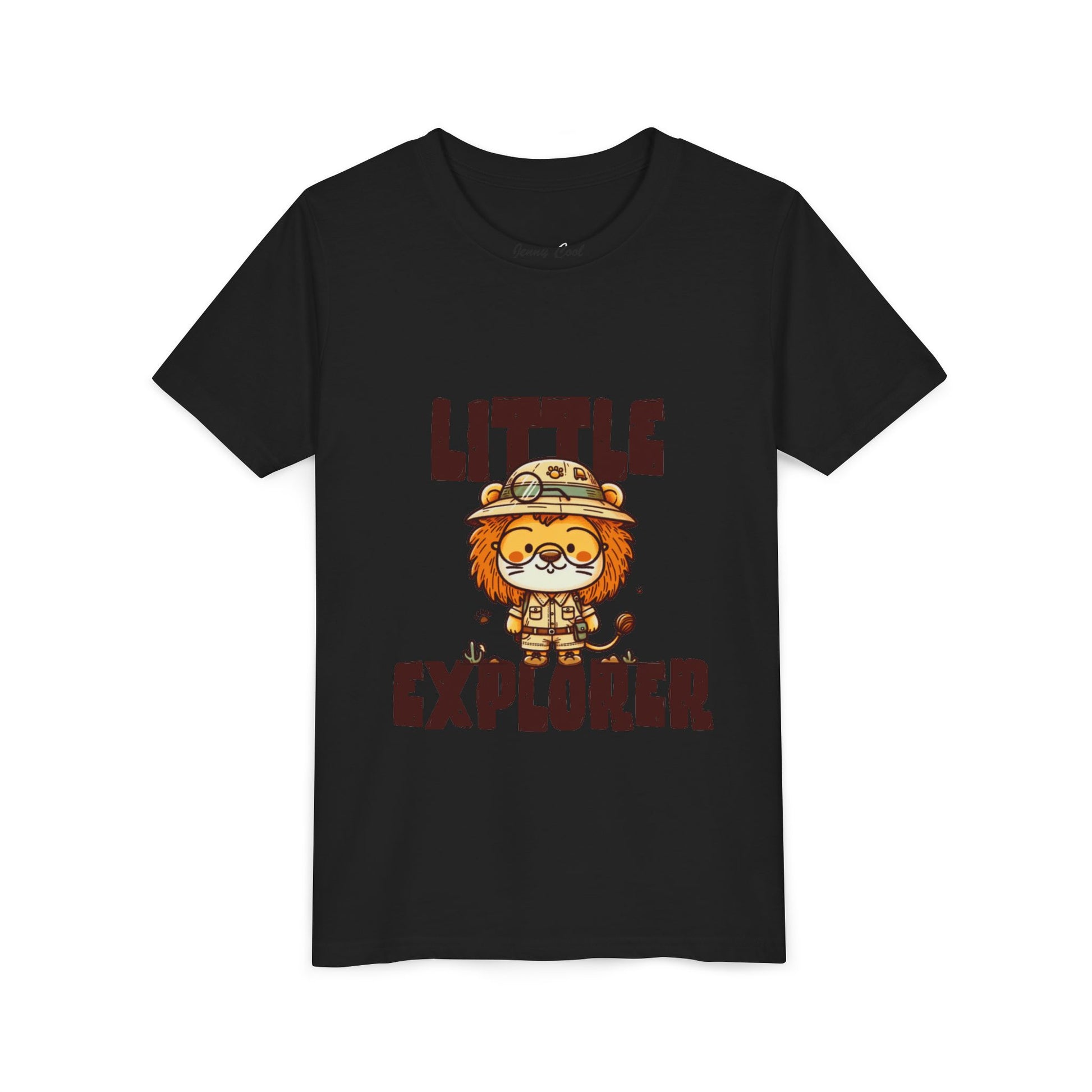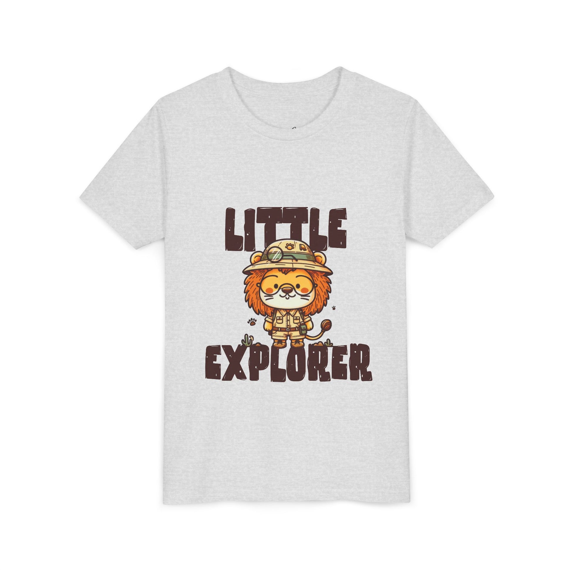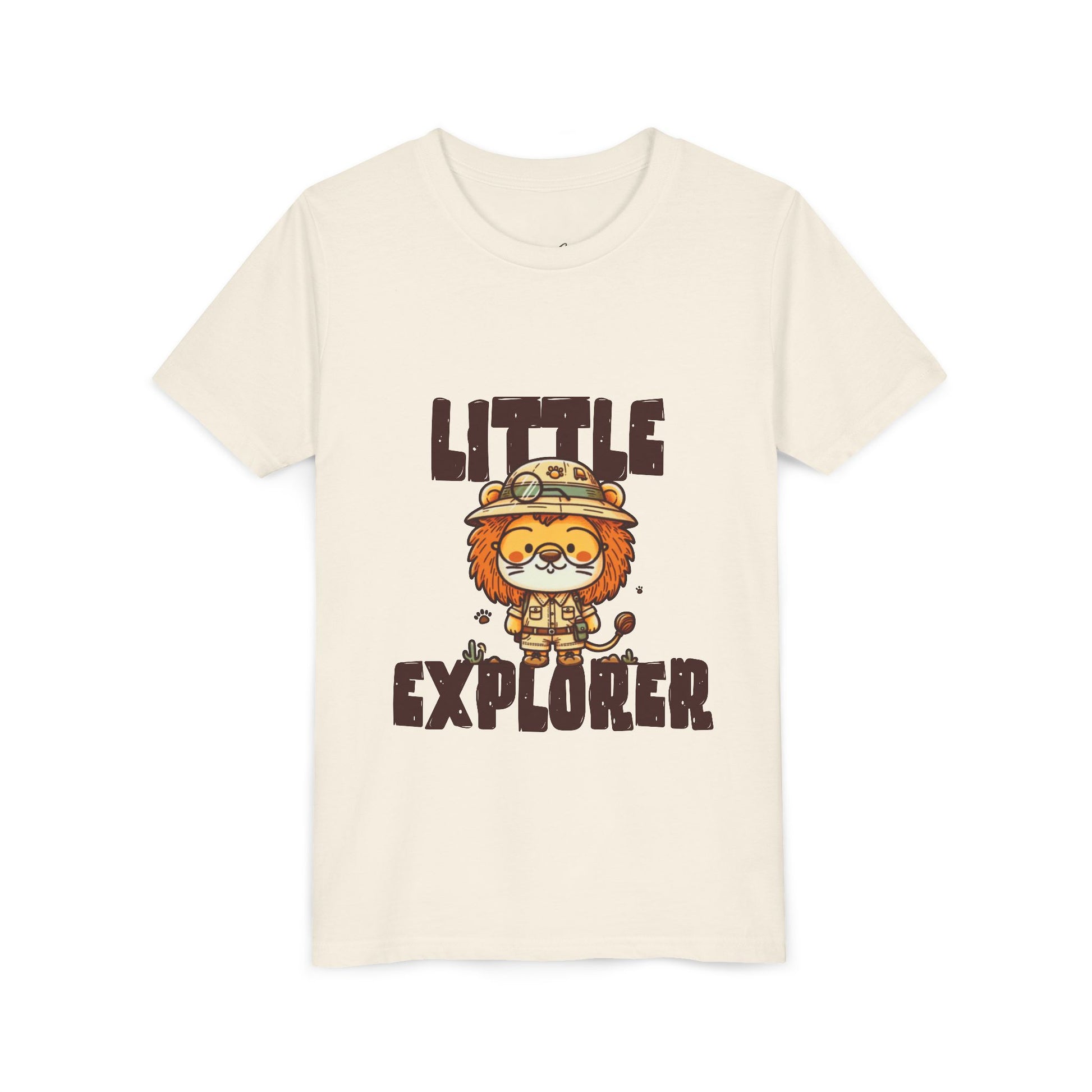 At the heart of the design stands an adorable lion explorer, proudly wearing a safari hat and ready for adventure. Paired with the bold “Little Explorer” lettering, the artwork captures the joyful spirit of discovery — from backyard safaris to playground expeditions.
