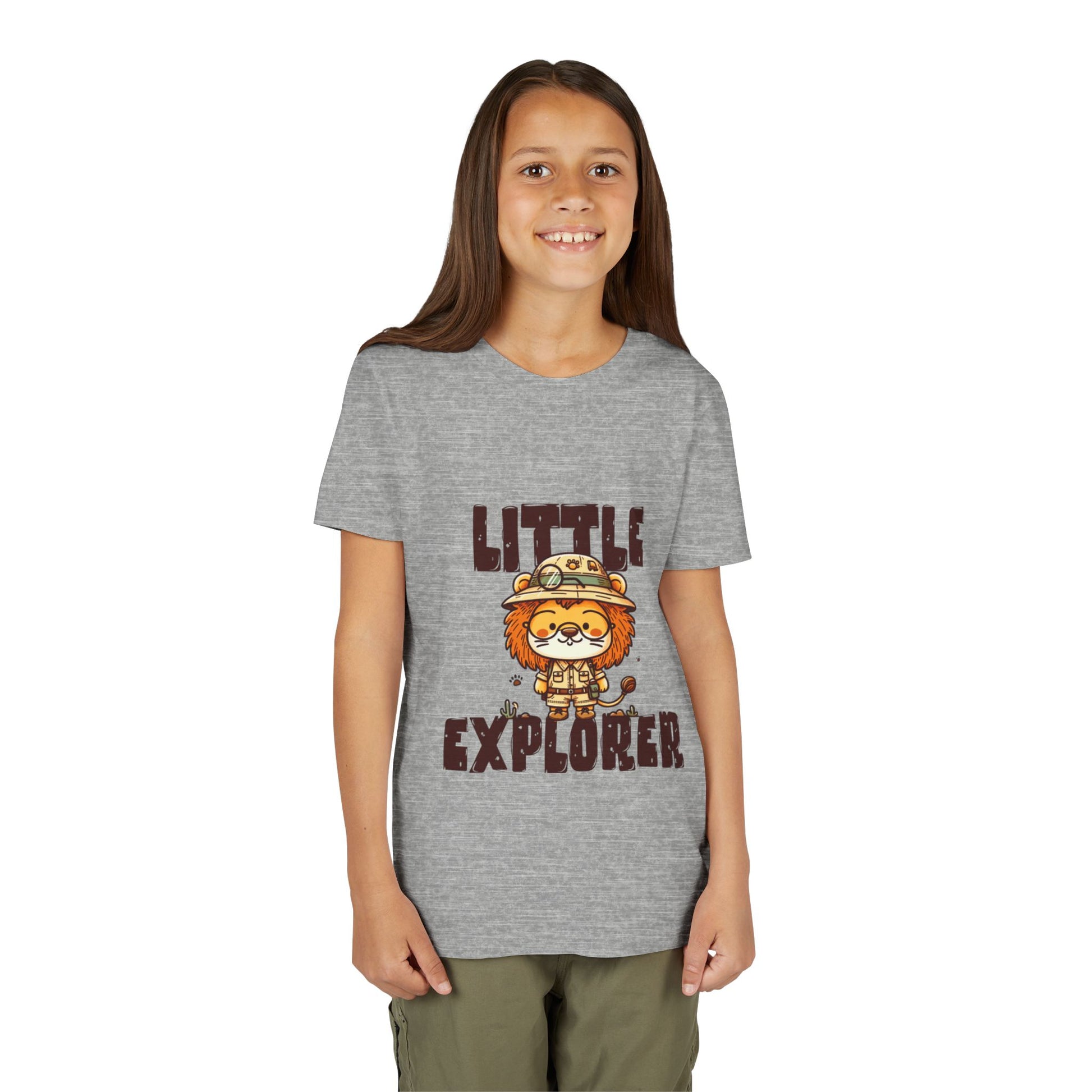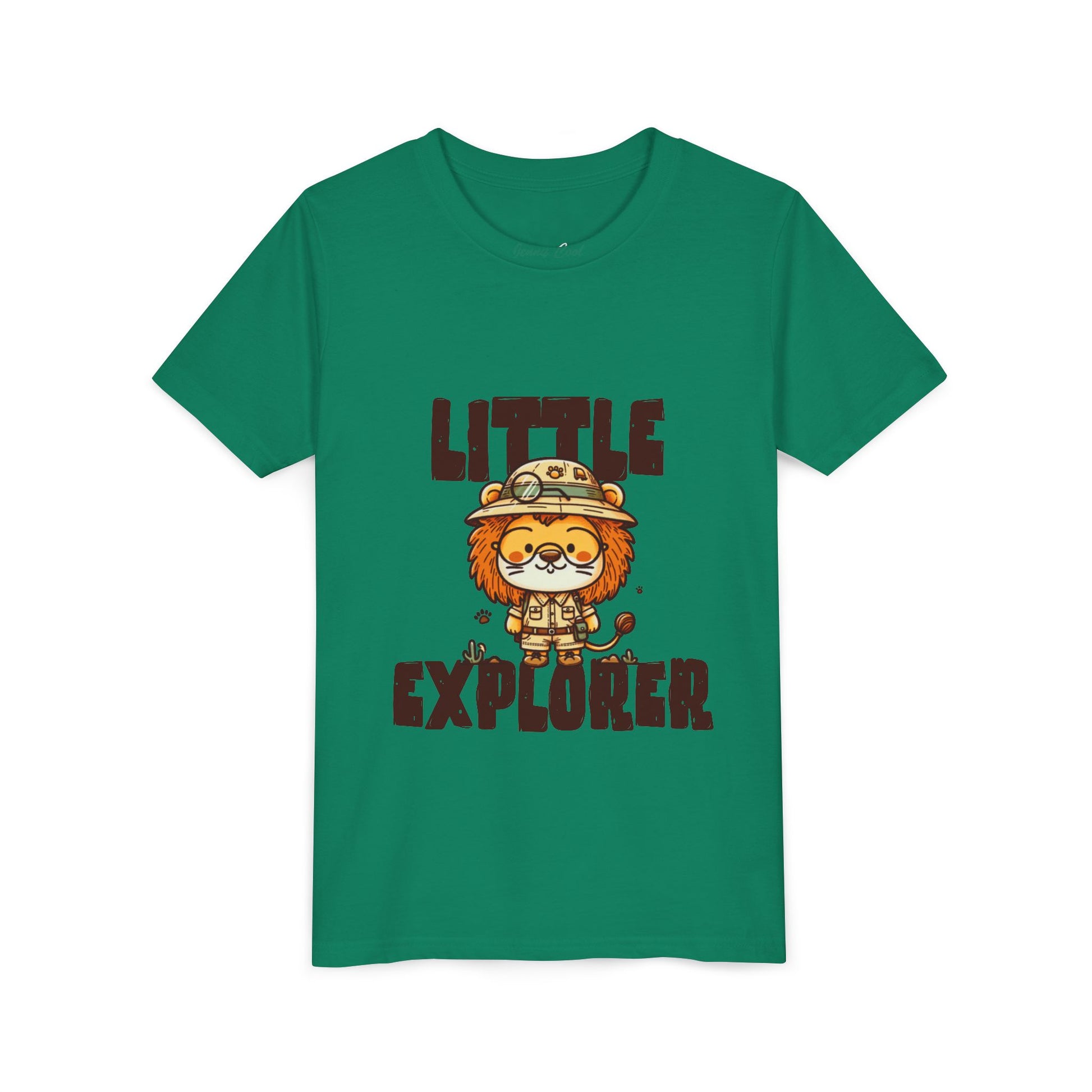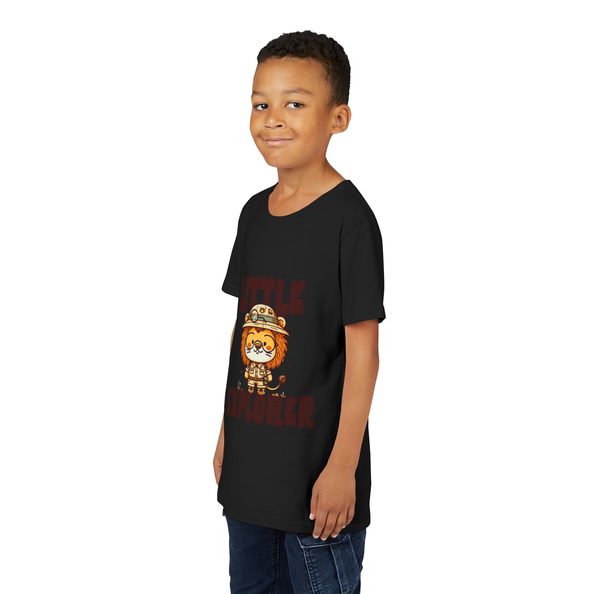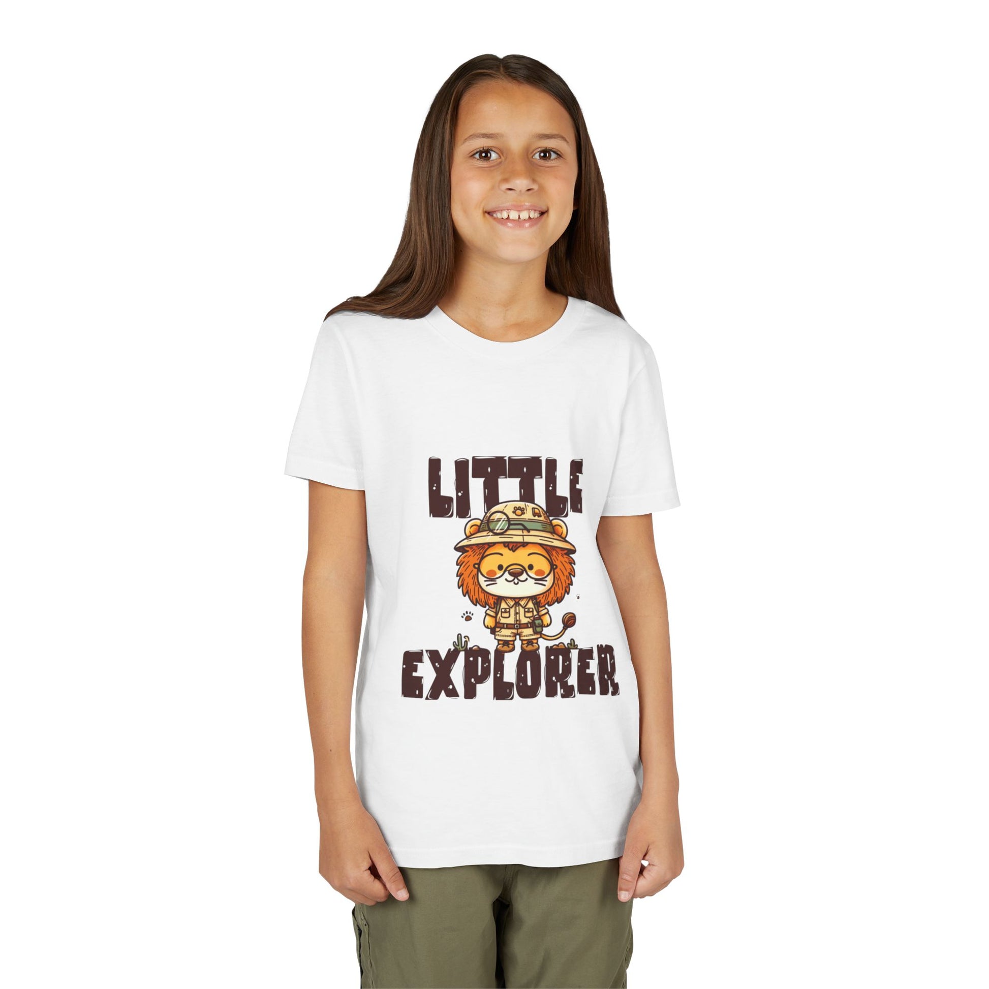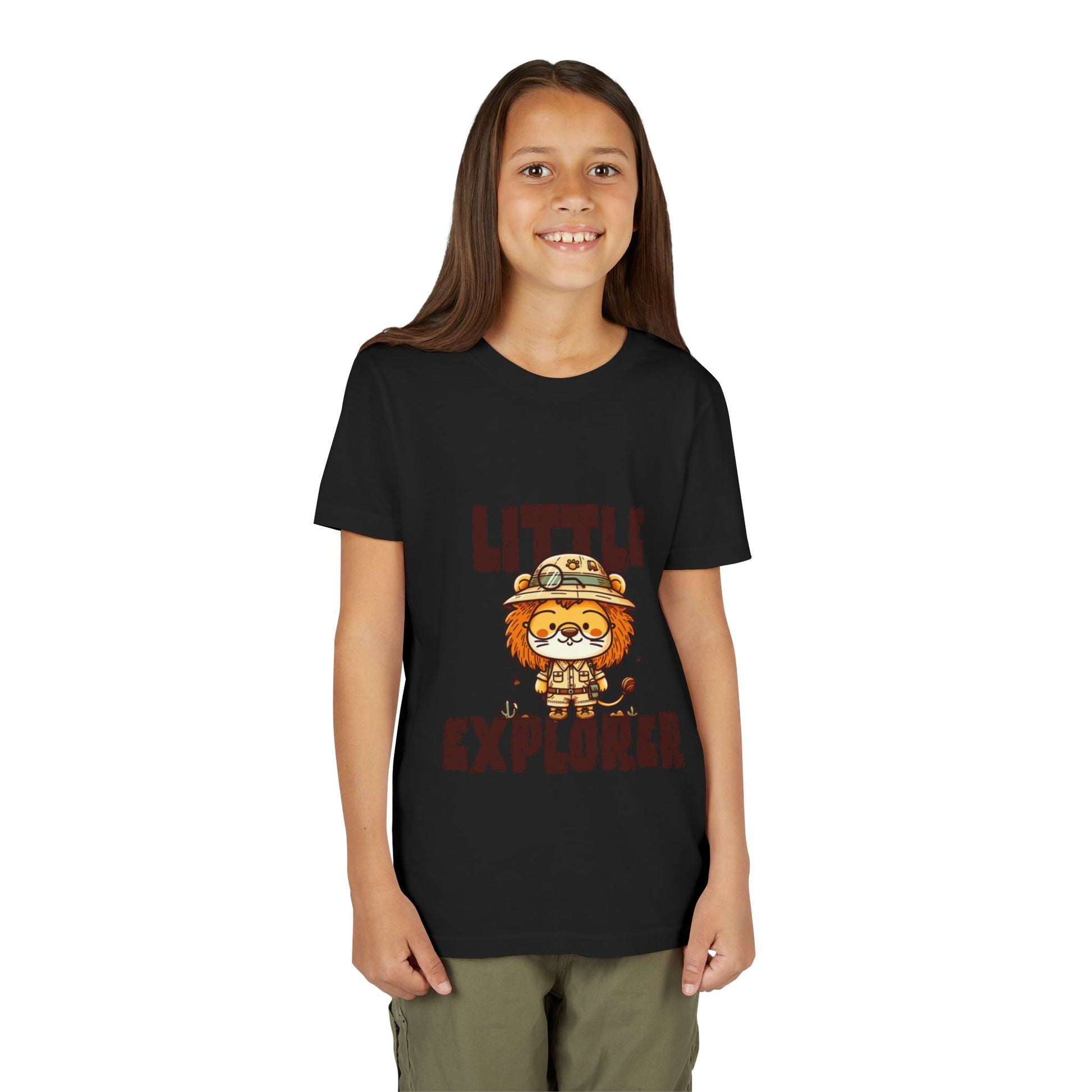 At the heart of the design stands an adorable lion explorer, proudly wearing a safari hat and ready for adventure. Paired with the bold “Little Explorer” lettering, the artwork captures the joyful spirit of discovery — from backyard safaris to playground expeditions.