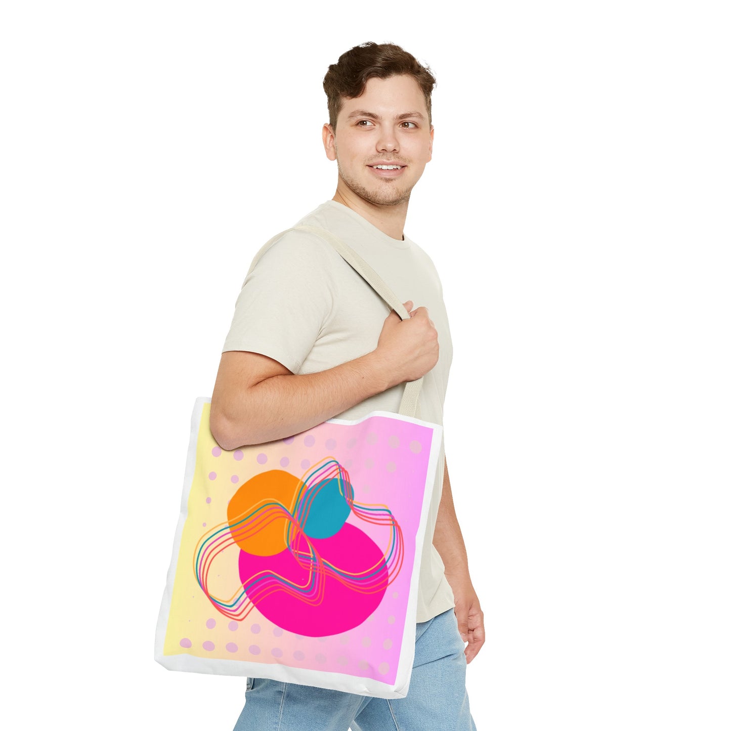 Available in 3 sizes to add both functionality and style, these custom-printed tote bags come with multiple handle colors to match your designs. Made with spun polyester, these bags feature double-stitched seams, cotton webbing straps, and nonwoven laminate lining for high-end durability. Your all-over print is created with dye sublimation for high-end visuals.